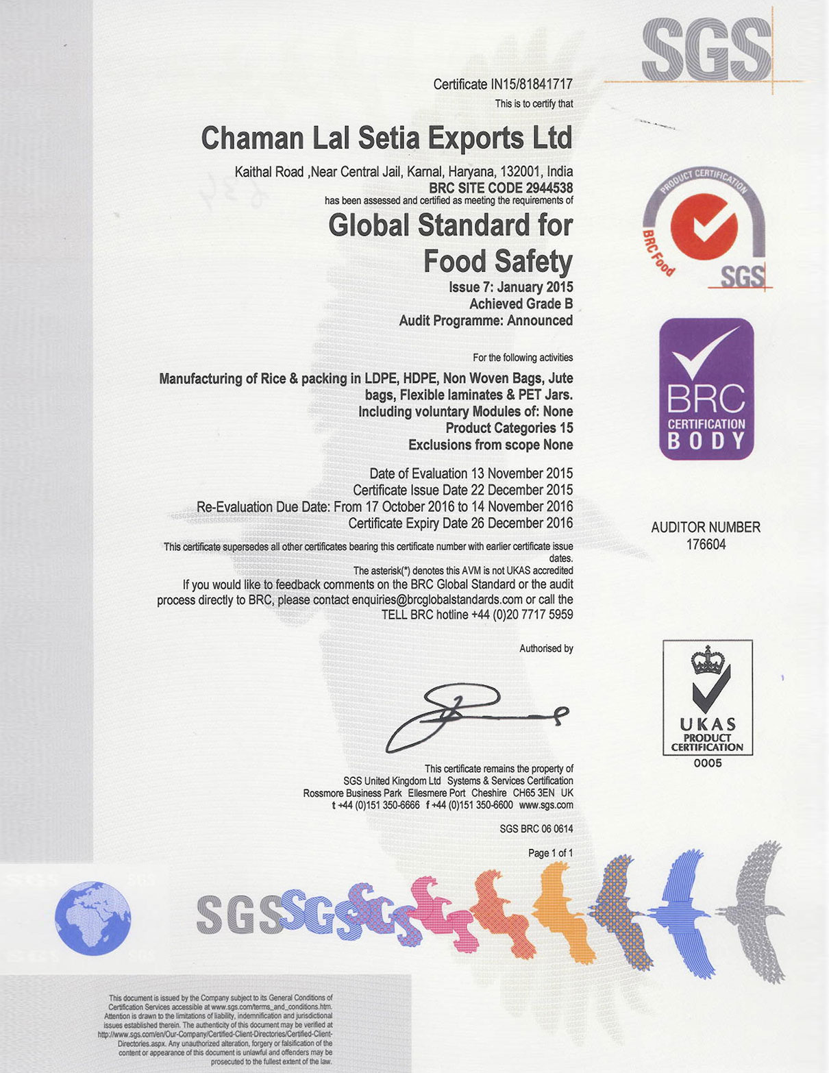 Global Standard for Food Safety, BRC Food Product certification from SGS,