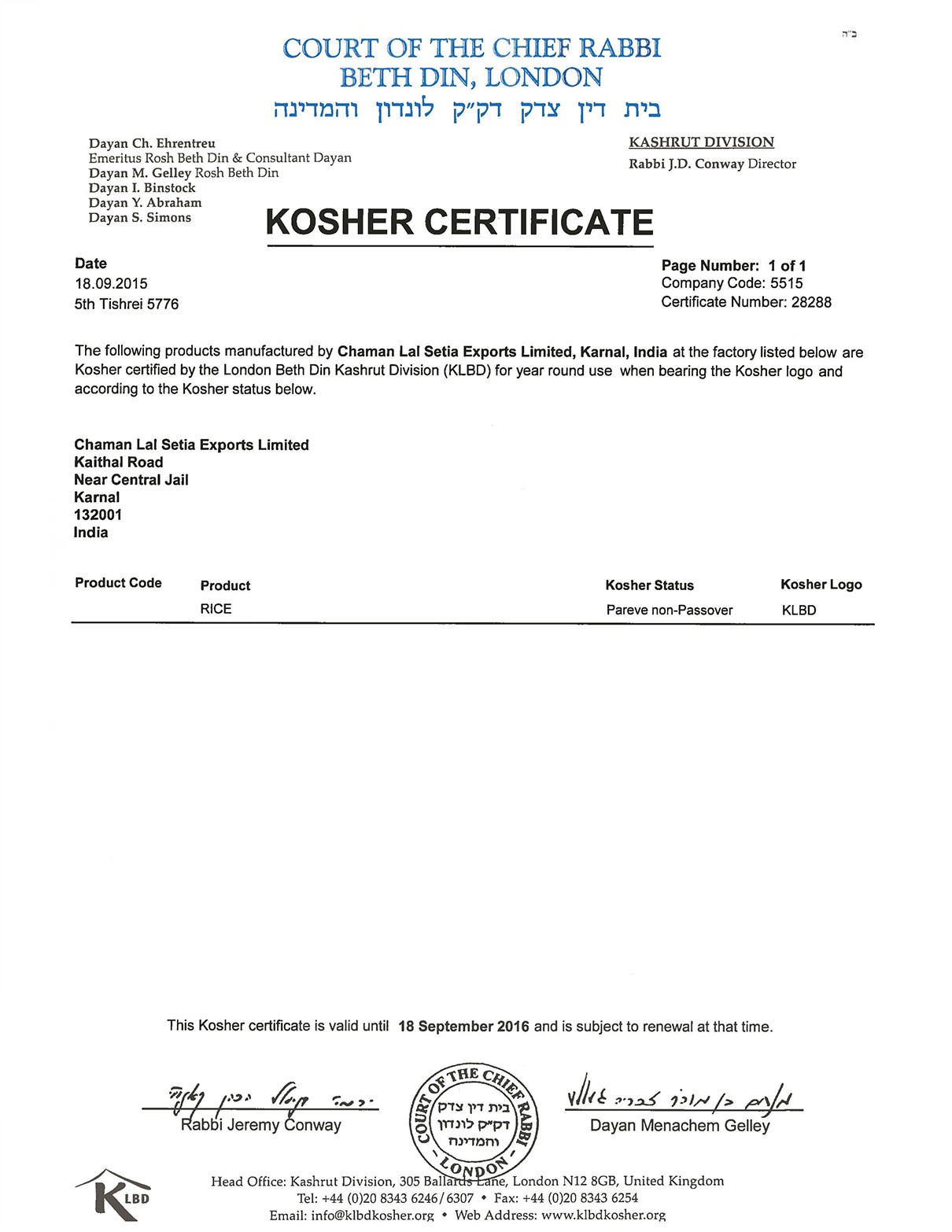 Kosher Certificate by London Beth Din Kashrut Divison (KLBD)
